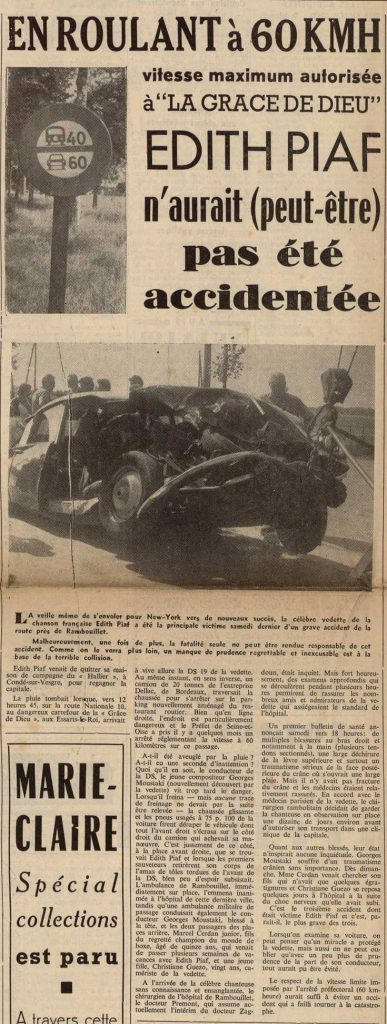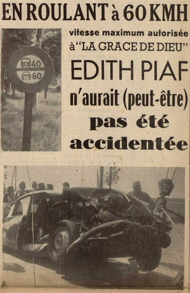 Début septembre 1958, Georges Moustaki est au volant de la DS d’Édith Piaf, la célèbre chanteuse pour qui il venait d’écrire le titre Milord. Alors qu’il roule à vive allure sur la RN 10, sous la pluie, Georges Moustaki ne voit que trop tard un camion qui vire brutalement sur la gauche. Il ne parvient pas à l’éviter. La collision, au niveau du carrefour de la grâce de Dieu, est brutale. Si le conducteur ne s’en sort pas trop mal, Edith Piaf, assise à la place  »du mort » souffre de plusieurs blessures. Elle a été transportée à l’hôpital de Rambouillet où elle a été soignée une dizaine de jours. La tournée qu’elle devait débuter aux États-Unis à cette période-là a été reportée au mois de décembre 1958.